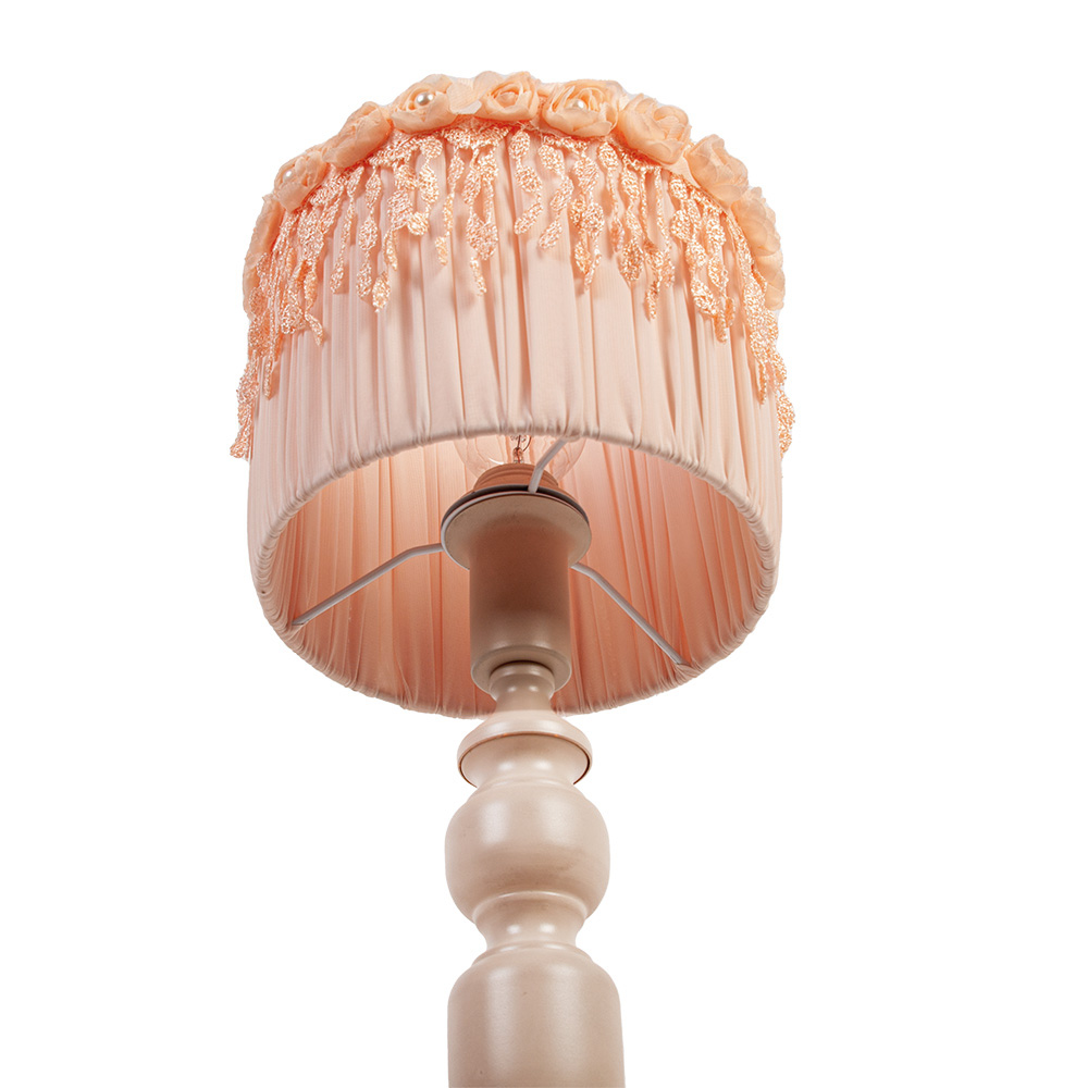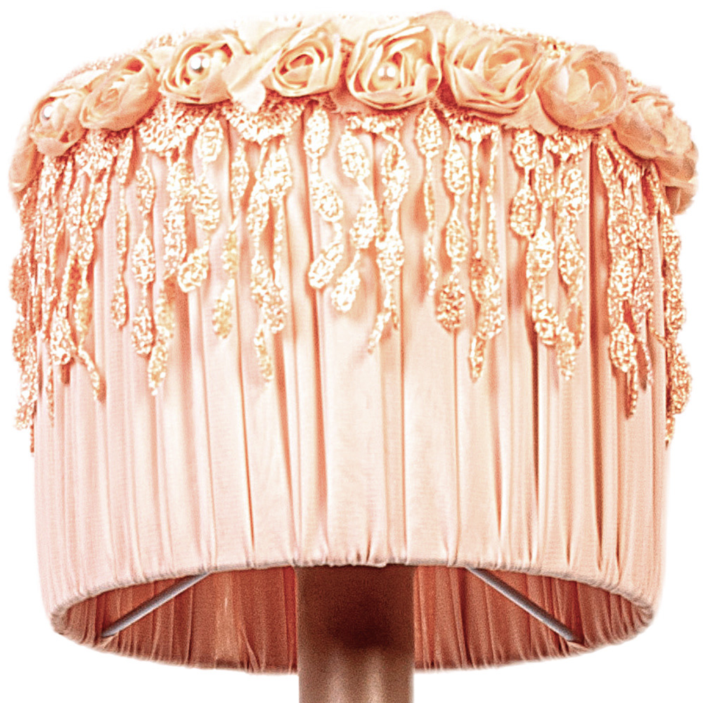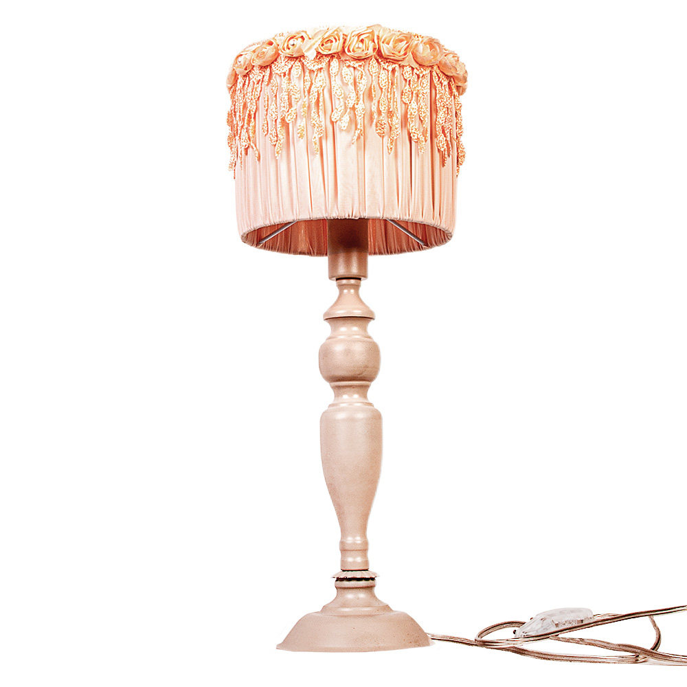 Её кремовая металлическая ножка, словно танцующая в лучах заката, гармонично сочетается с абажуром-шедевром: конус из нежно-розовой ткани украшен изящной вышивкой розами, чьи лепестки будто шепчут о весне, а бахрома добавляет ноты романтической таинственности. Каждый стежок выполнен вручную, что делает лампу единственной в своём роде — как картина, написанная кистью мастера.