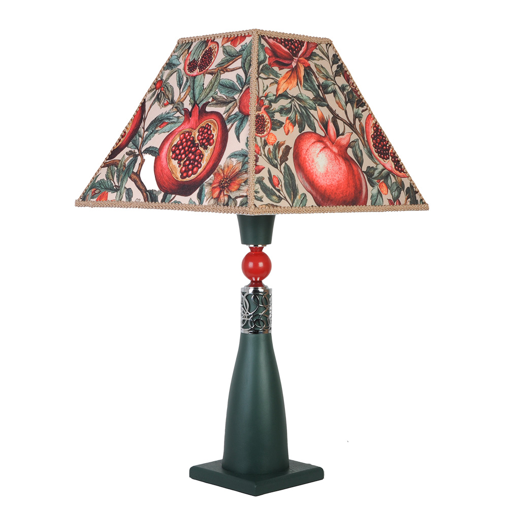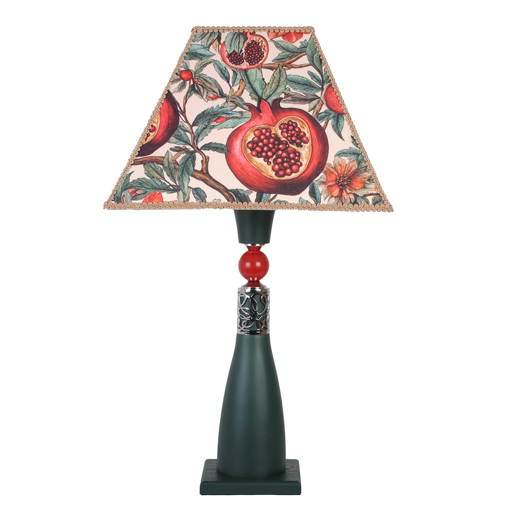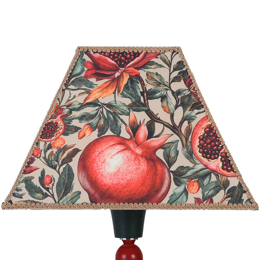 Абажур в форме изящной пирамиды словно распускается на свету — благодаря тонкой текстильной росписи. Её абажур украшен ярким и красочным узором с изображением гранатов и цветов, выполненным в теплых оттенках красного, оранжевого и зеленого. Мягкий, почти акварельный рисунок дарит ощущение гранатового сада, а лёгкая ткань позволяет свету рассеиваться естественно и уютно. Каждая сторона абажура - это отдельный сюжет.