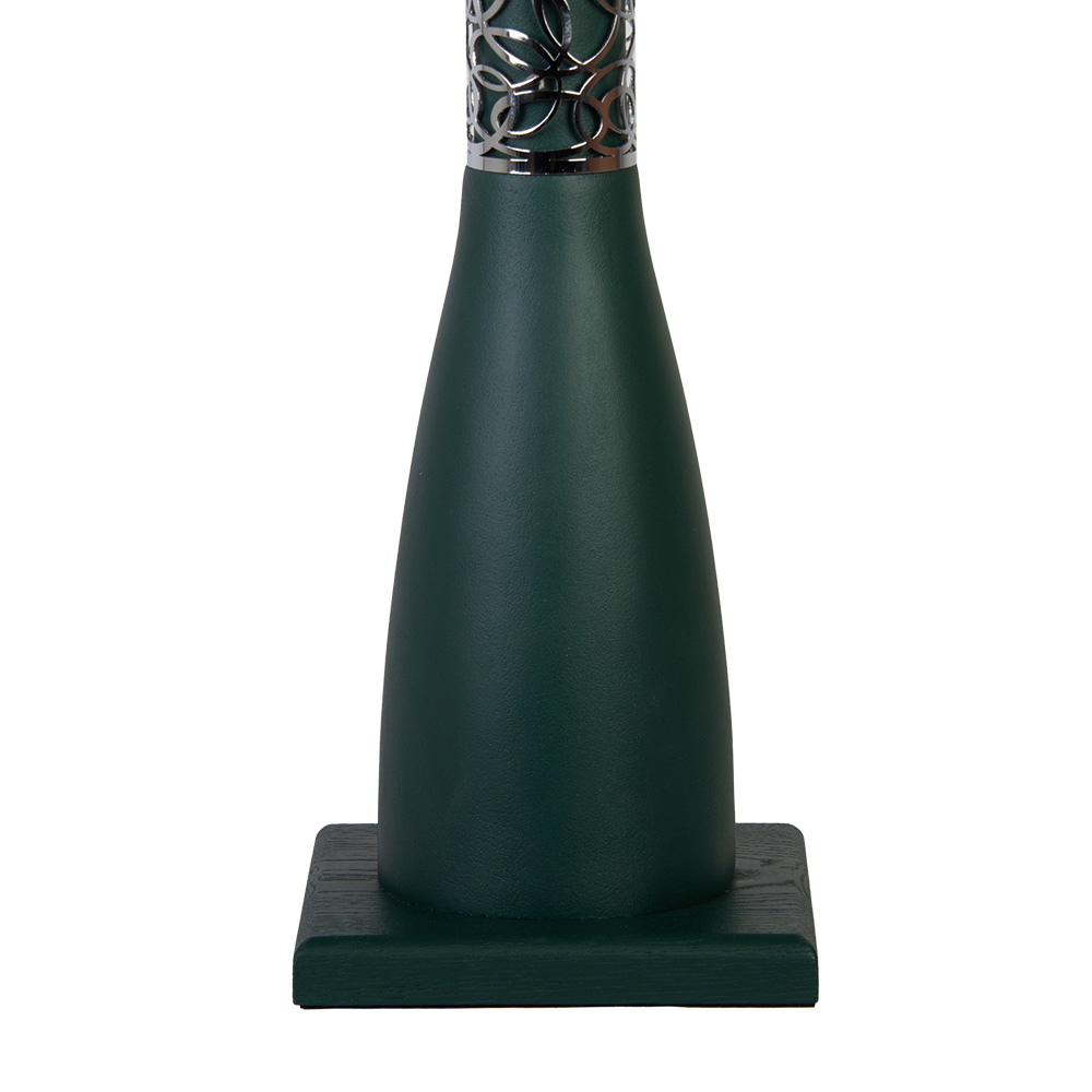 Основание, напротив, решено в благородной тёмно-зеленой гамме. Его конусообразная колонна из искусственного камня с плавным переходом в квадратную базу из натурального дуба придаёт лампе архитектурную выразительность, делая её визуально устойчивой и основательной. Хромированный декоративный элемент с узором, напоминающим ветви, выступает связующим звеном между строгой геометрией низа и живописным верхом. А завершающий штрих — красно-кирпичный деревянный шар на стыке абажура и основания — привносит ту самую неожиданную ноту, которая превращает добротный светильник в предмет гордости коллекционера.