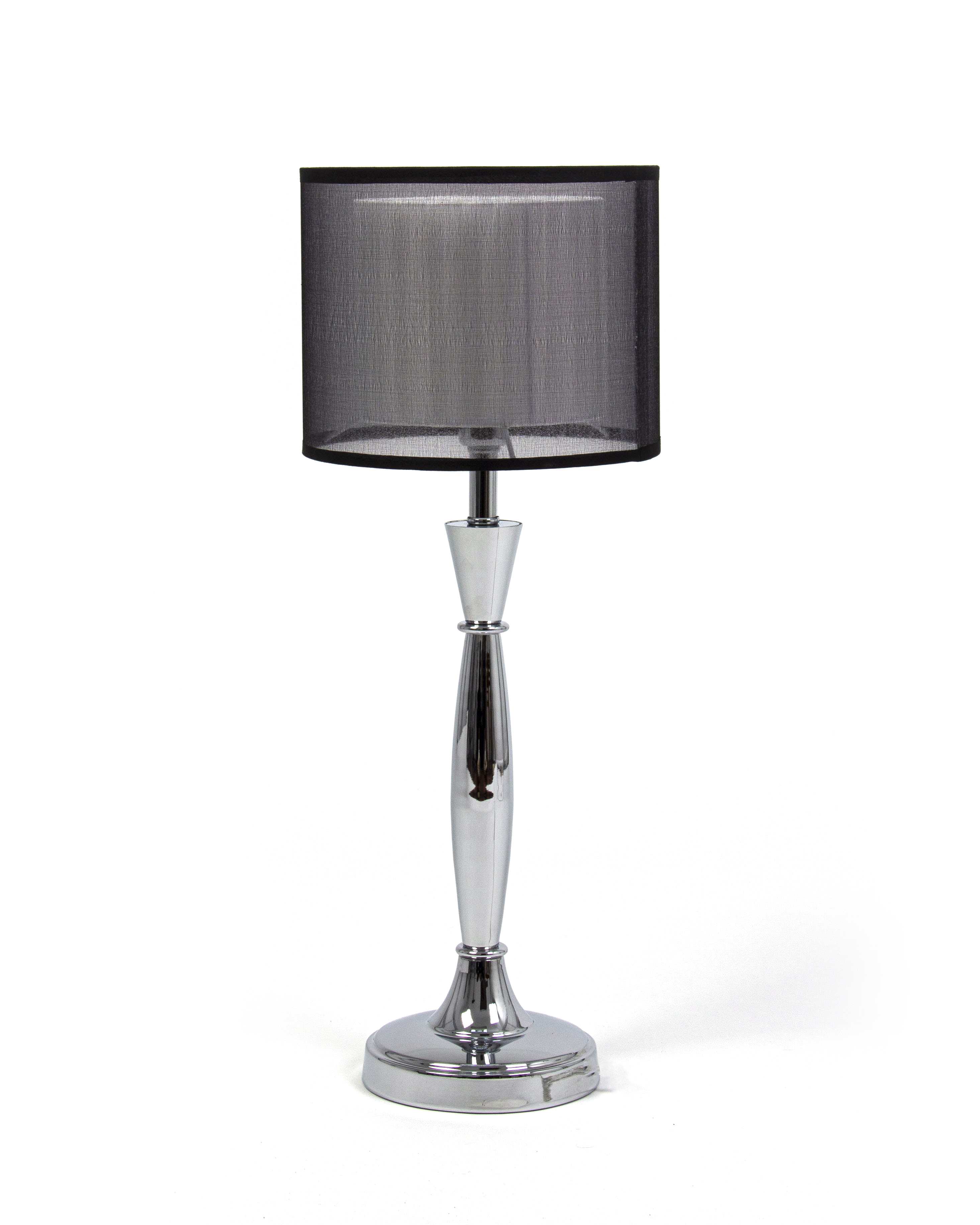 Настольная лампа с двойным абажуром. Внутренняя часть абажура выполнена в намотку из белой ленты, внешняя часть из черной органзы на пластиковой основе. Основание лампы-металл в хромовом цвете. Настольная лампа подойдет в интерьер "Современный", "Контемпорари".