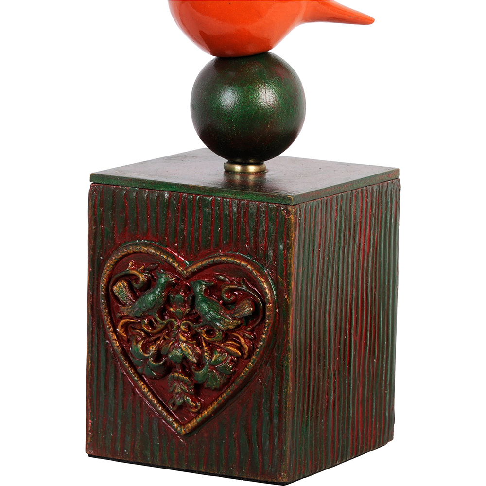 Ее основой служит массивная деревянная подставка темно-зеленого цвета, на которой красуется сердце — символ тепла и уюта, украшенный затейливыми русскими орнаментами. От этого сердца тянется ввысь изящный стебель, где темно-зеленые шары словно бусины сменяются парой ярко-красных керамических птиц. Эти птицы — не просто декор, это хранители вашего очага, приносящие в дом радость и динамику.