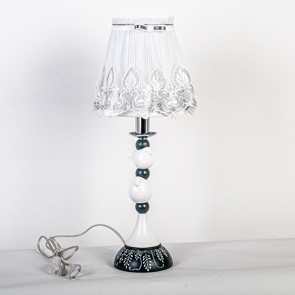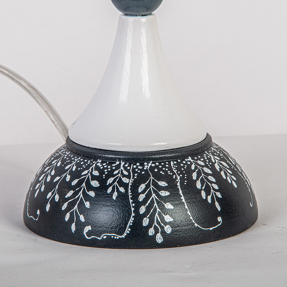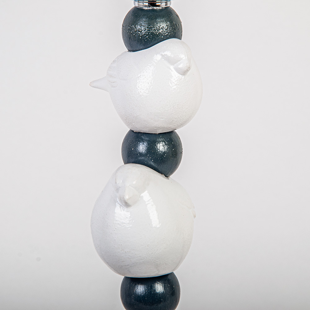 Этот светильник — настоящее произведение прикладного искусства, где каждая деталь продумана до мелочей. Стройный керамический силуэт, декорированный изысканным чередованием миниатюрных белых птичек и благородных чёрных деревянных шариков, несёт в себе отголоски классической эстетики.