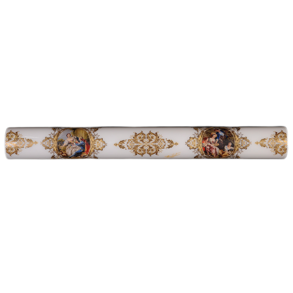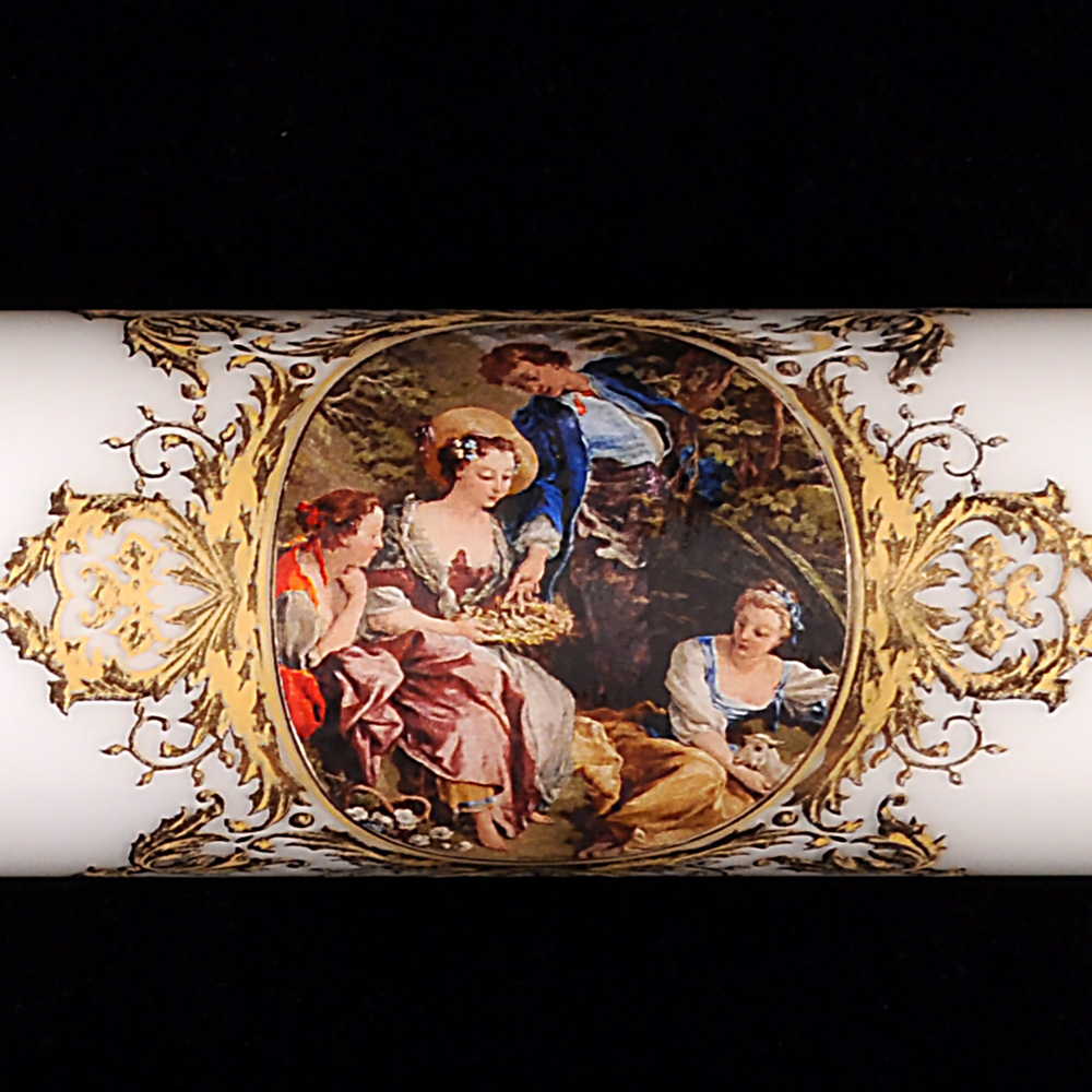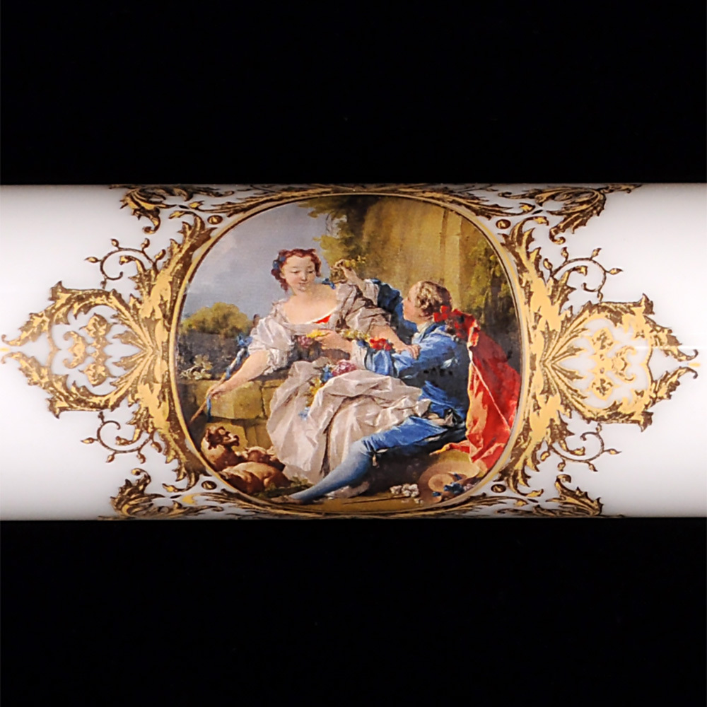 Его белоснежный плафон, словно холст художника, объединяет две утонченные сцены: романтическое свидание в цветущем саду, где влюбленные обмениваются букетом под взглядом верной собаки, и таинственный диалог героев XVIII века, застывших среди золотых завитков и листвы. Каждый элемент, от матового стекла до изысканной золотой инкрустации, излучает аристократизм.