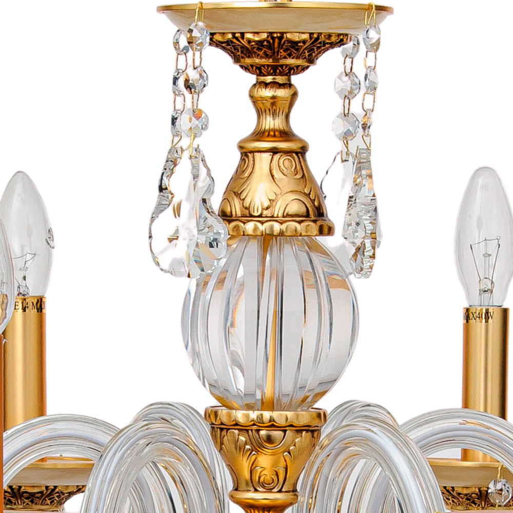 Но главное волшебство начинается, когда свет проходит сквозь прозрачные хрустальные подвески. Здесь есть всё: каплевидные кристаллы, цилиндрические огранённые призмы и круглые линзы — каждая форма играет по-своему, дробя луч на радужные блики. Шесть ламп, стилизованных под пламя свечей, мягко мерцают на золотых держателях, создавая романтическую, почти театральную атмосферу. Люстра щедро освещает до 15 м² — идеально для просторной гостиной, парадного зала ресторана или бальной комнаты. Здесь свет не просто рассеивается — он танцует, переливается, преображает каждый уголок, даря ощущение вечного праздника.