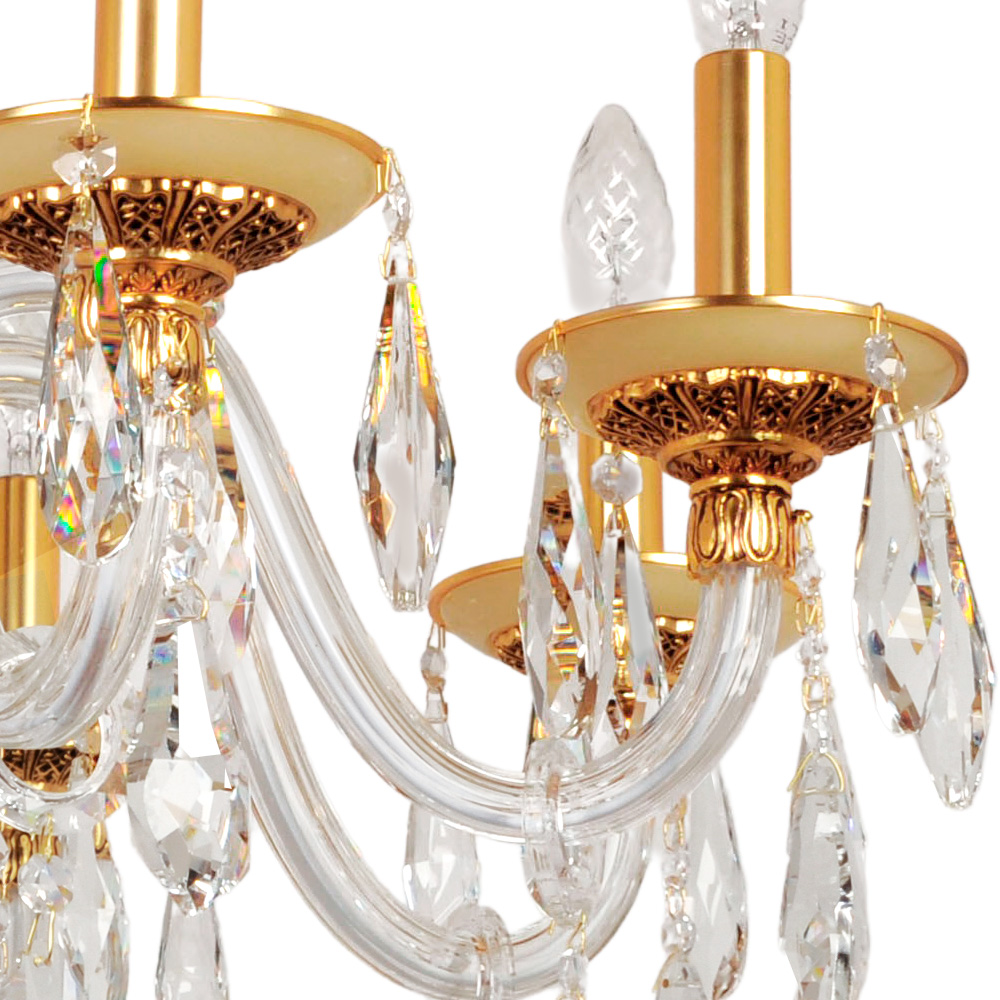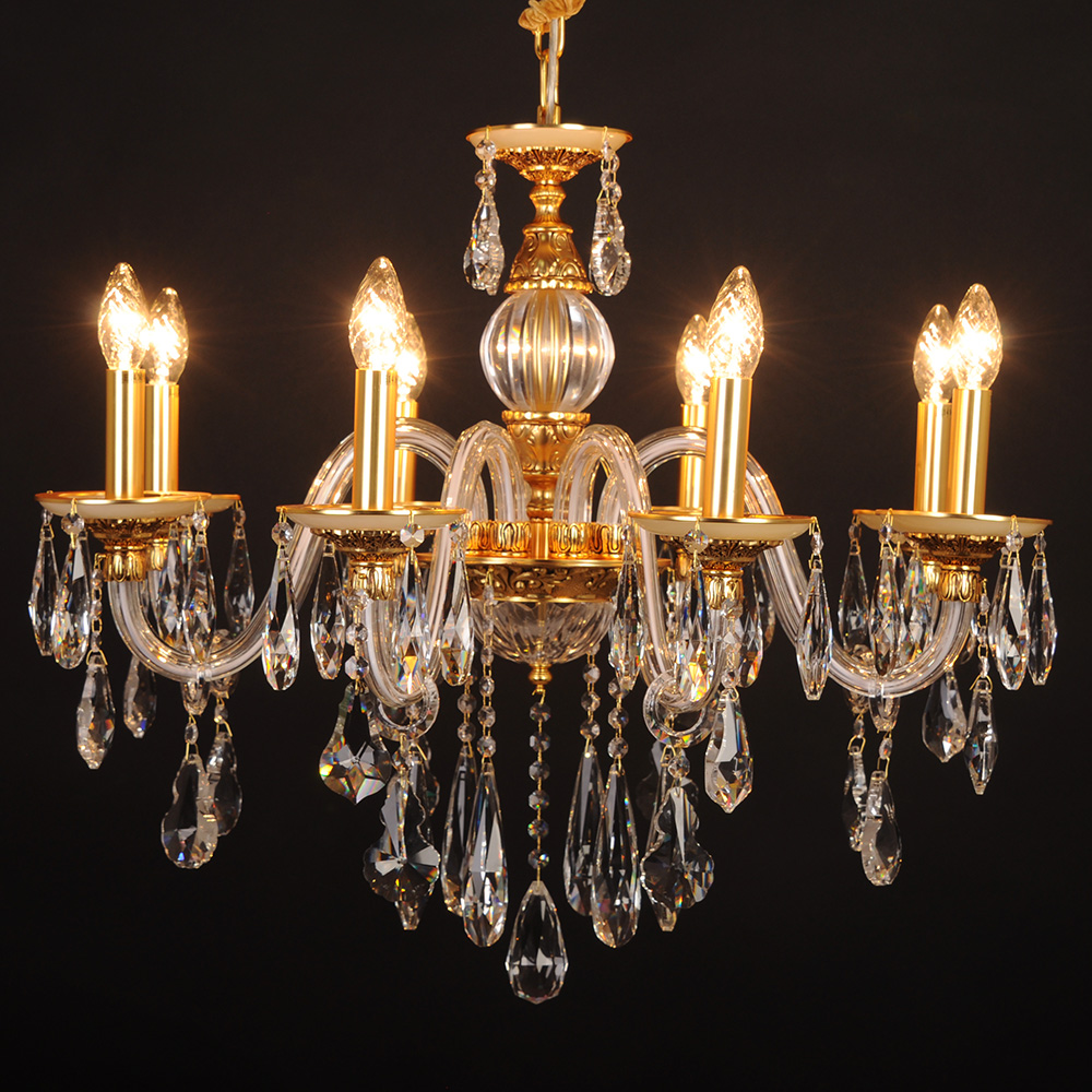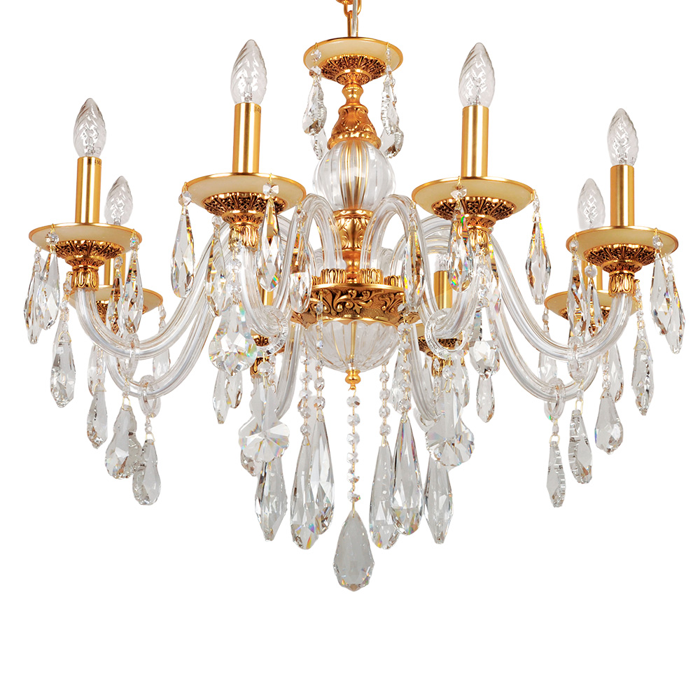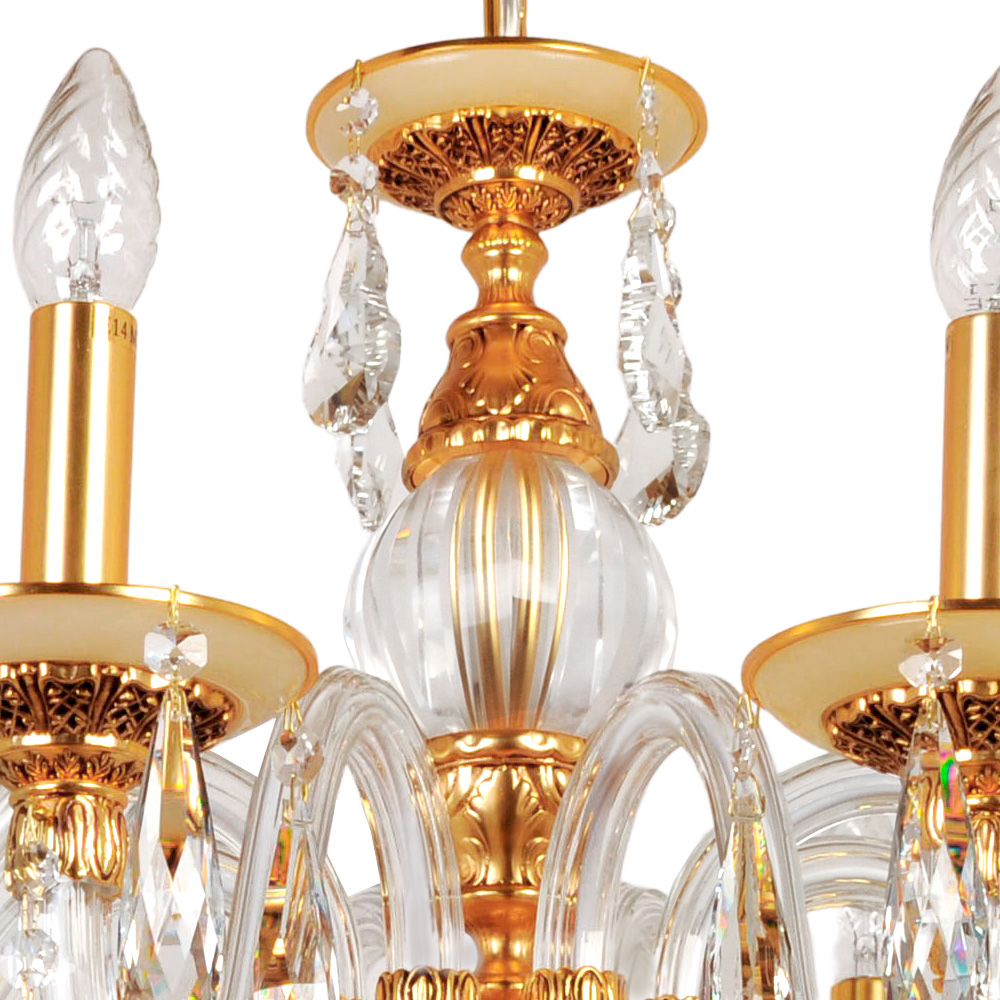 Когда свет гаснет, а вы нажимаете выключатель, Подвесная люстра Abrasax 3119/8 GO начинает свой тихий спектакль. Её центральный каркас, отлитый в благородном золотистом тоне, словно хранит тепло старинных дворцовых люстр. От него, подобно драгоценным побегам, расходятся изогнутые ветви — каждая покрыта хрустальной трубкой, отчего массивная конструкция кажется сотканной из утреннего инея. Восемь ламп, безупречно имитирующих живые свечи, замирают в золотых чашечках-держателях, обещая мягкое, живое мерцание.