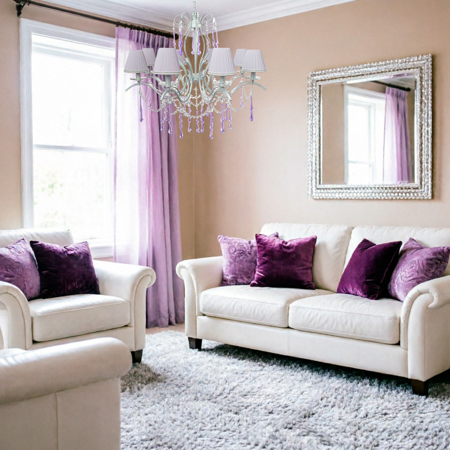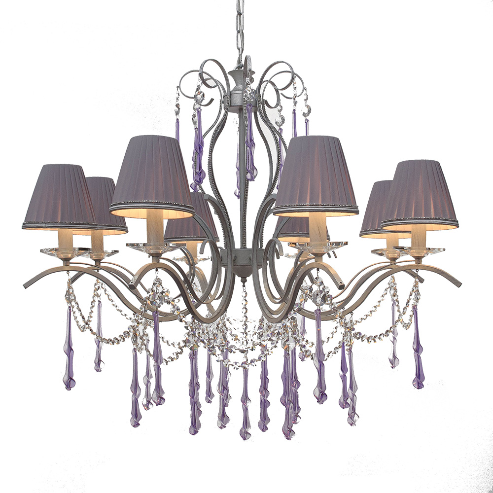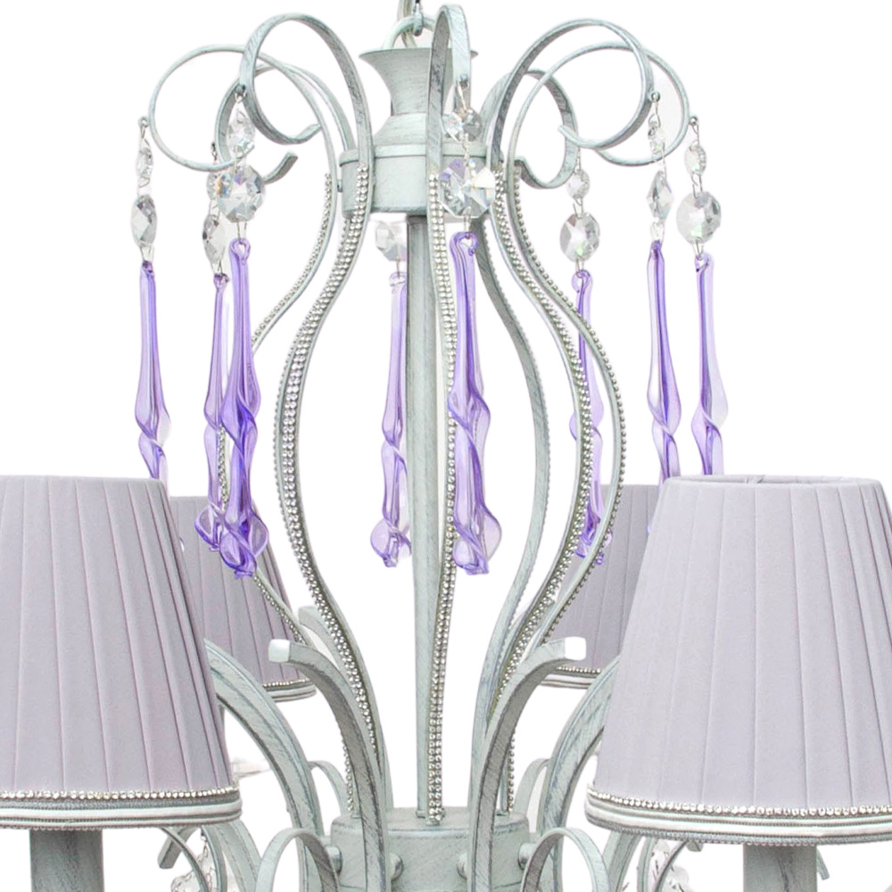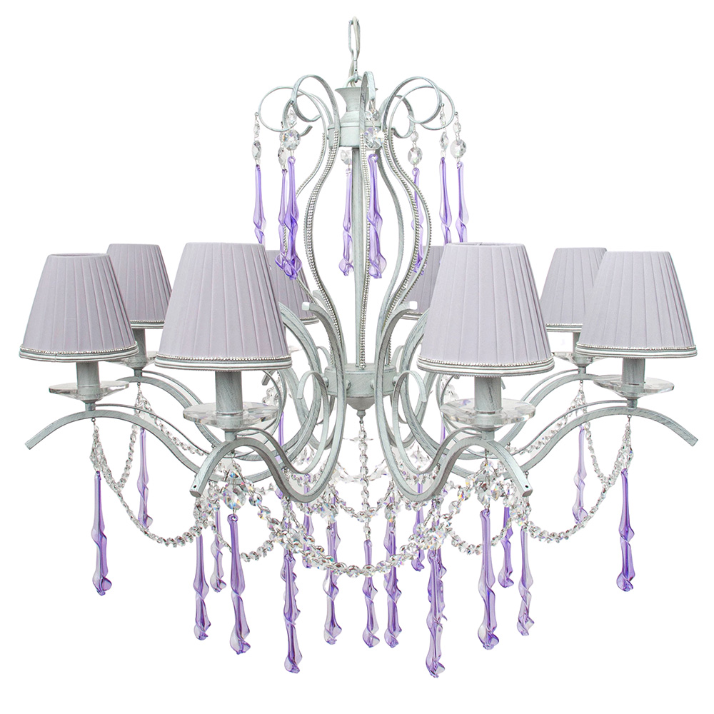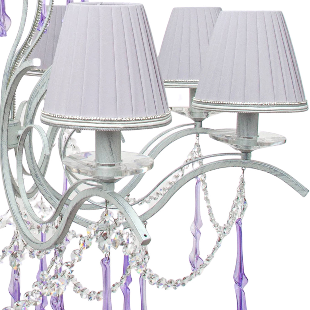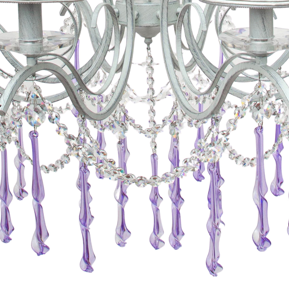Главное чудо скрыто в деталях: по всей длине люстры ниспадают цепочки хрустальных капель с фиолетовым отливом. При включении света они рождают россыпь бликов на стенах и потолке, превращая обычную комнату в парадный зал.