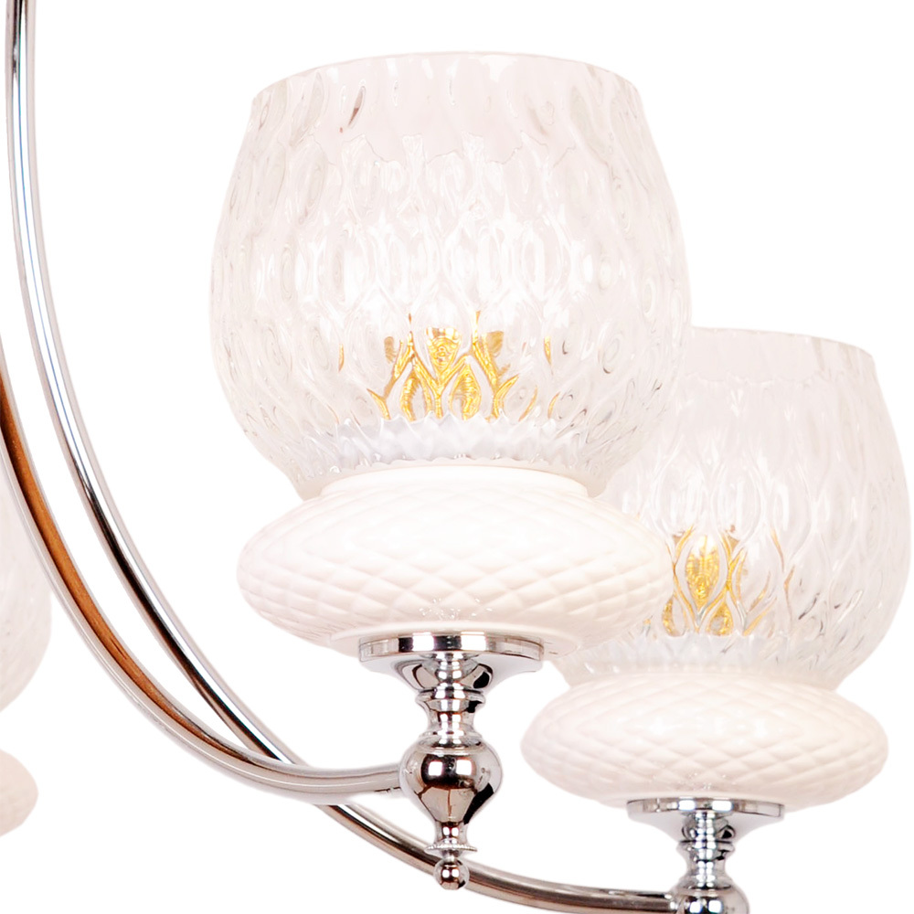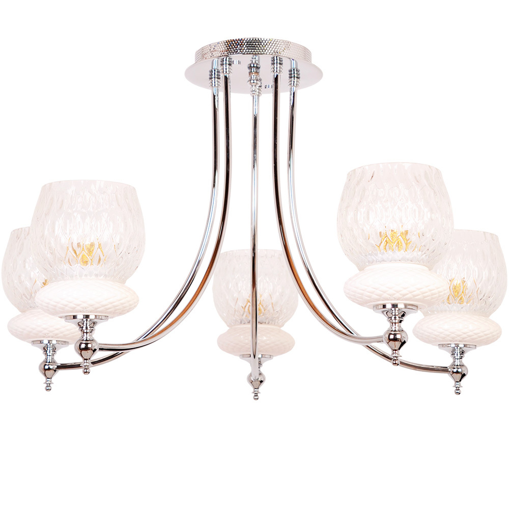 Пять прозрачных плафонов из рифлёного стекла, словно лепестки хрустального цветка, рассеивают свет в танце бликов и теней, а золотистые акценты добавляют ноты роскоши. Но главная изюминка — овальный элемент из рифлёного матового стекла под прозрачным плафоном.