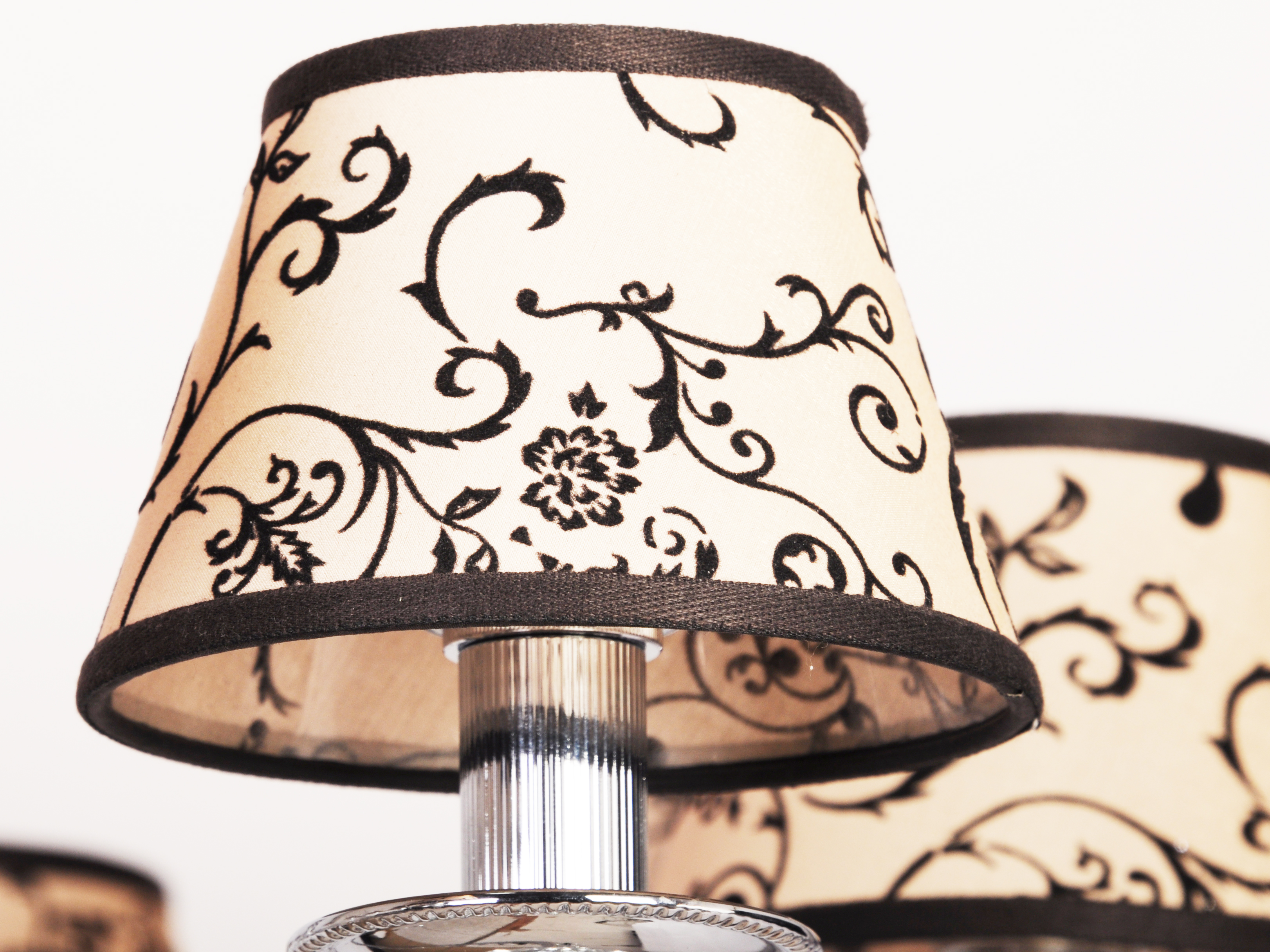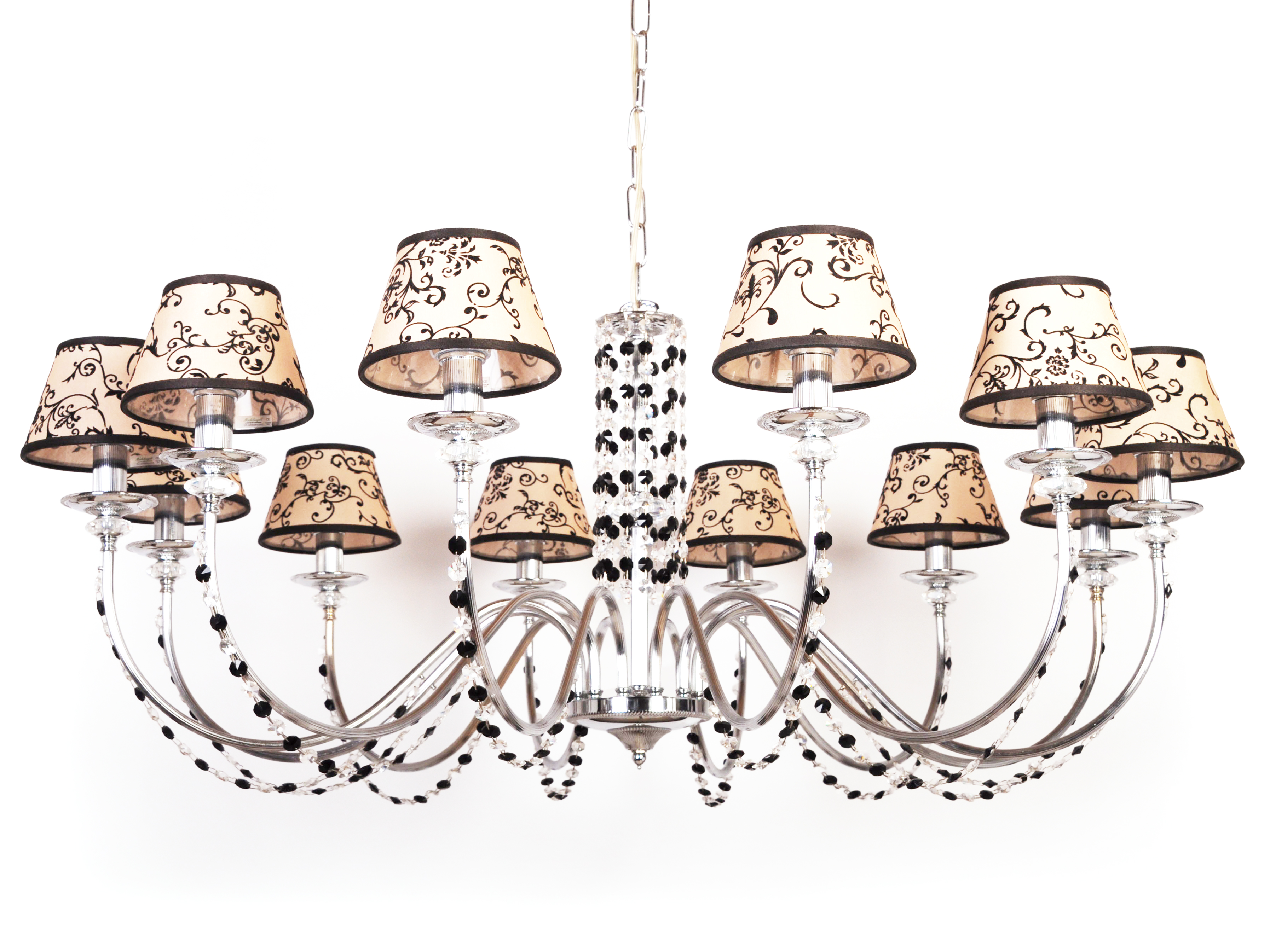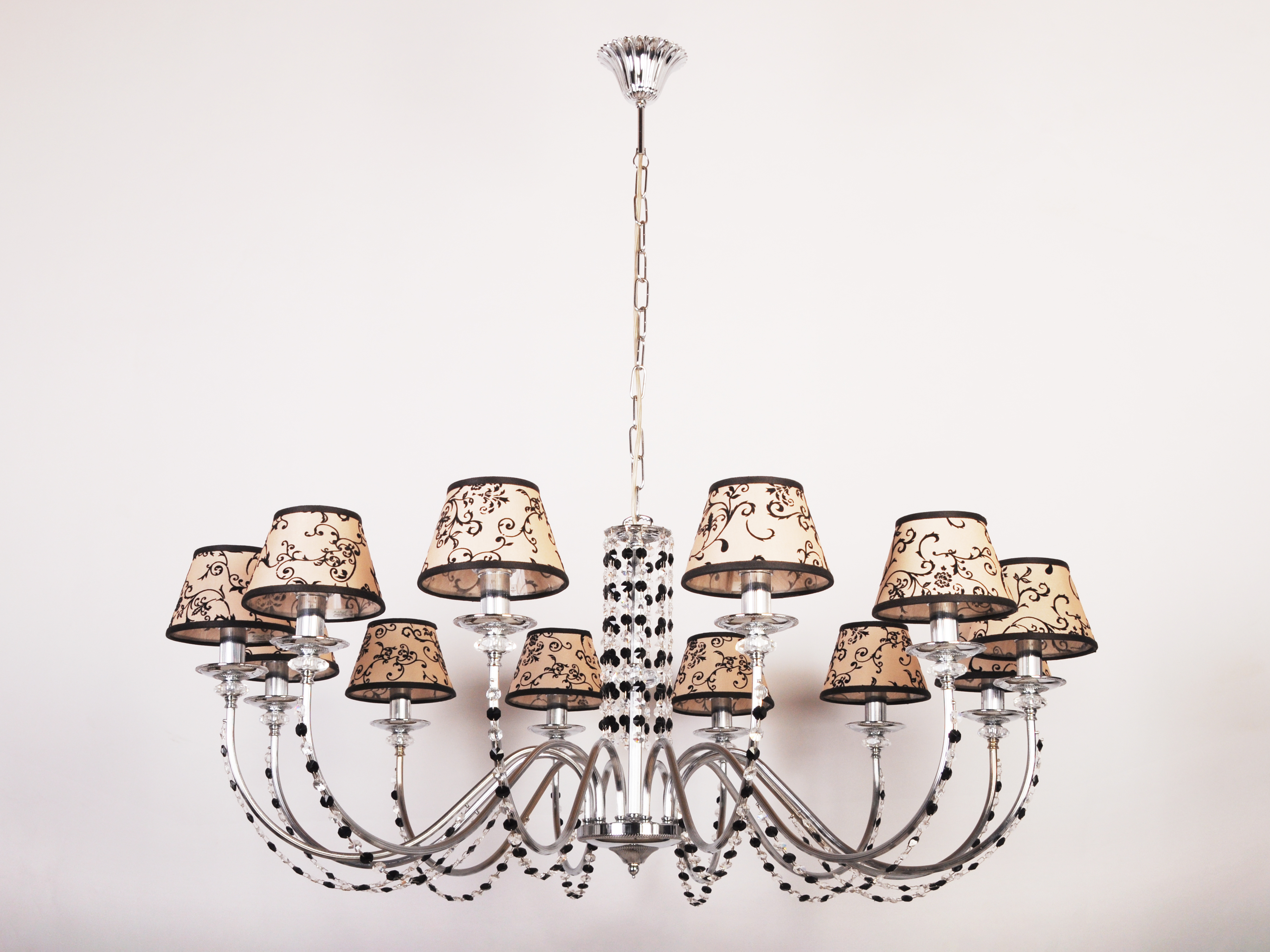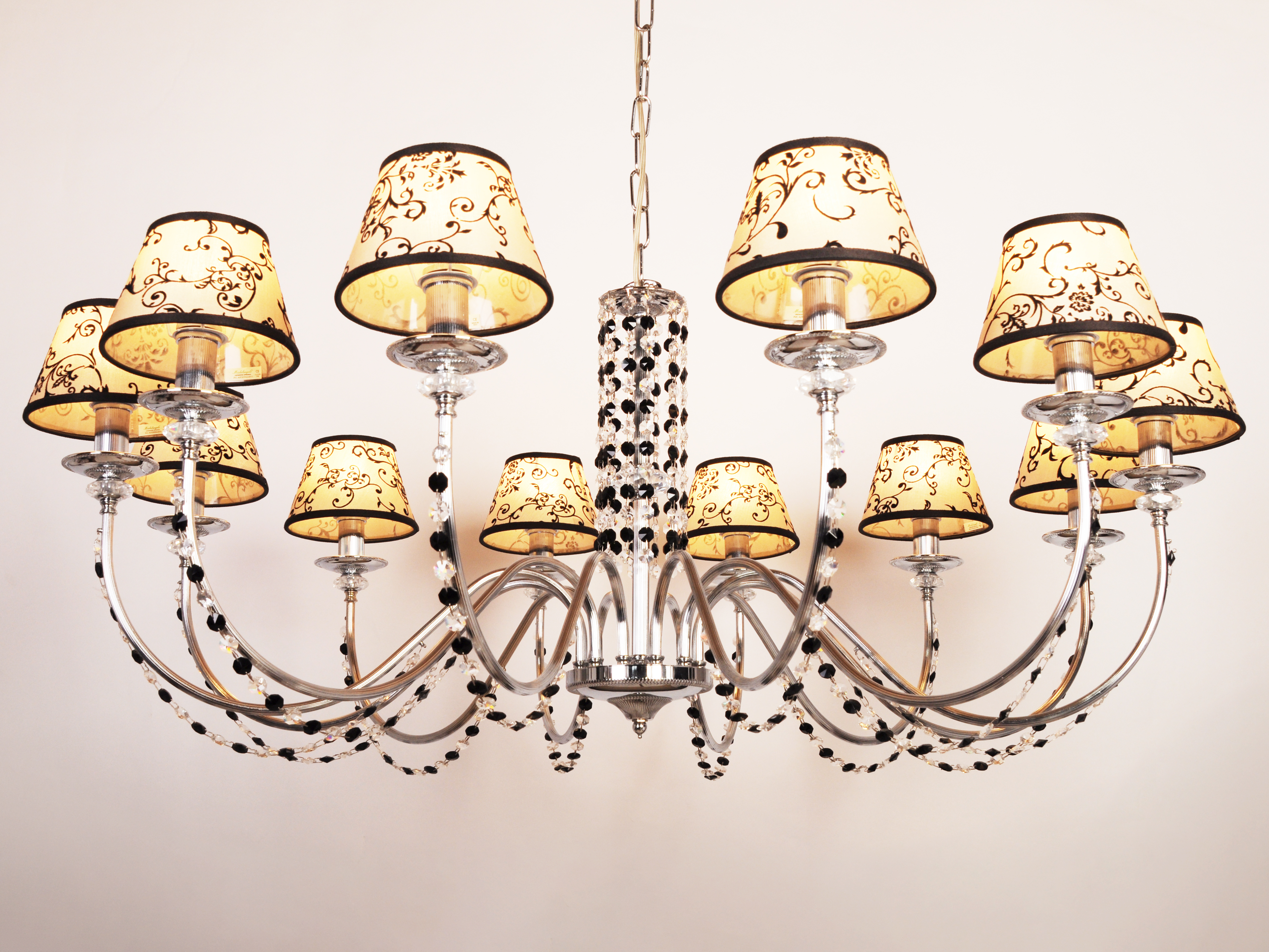 Её кремовые текстильные абажуры, украшенные изысканным орнаментом, напоминают шепот старинной саги: мягкий свет, проходя через конусы, окутывает помещение теплом и утонченностью. Эти абажуры не просто рассеивают свет — они создают игру теней и бликов, подчеркивая благородство подвесок из прозрачного и черного хрусталя.