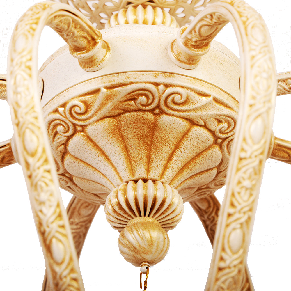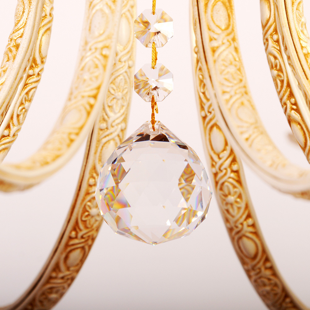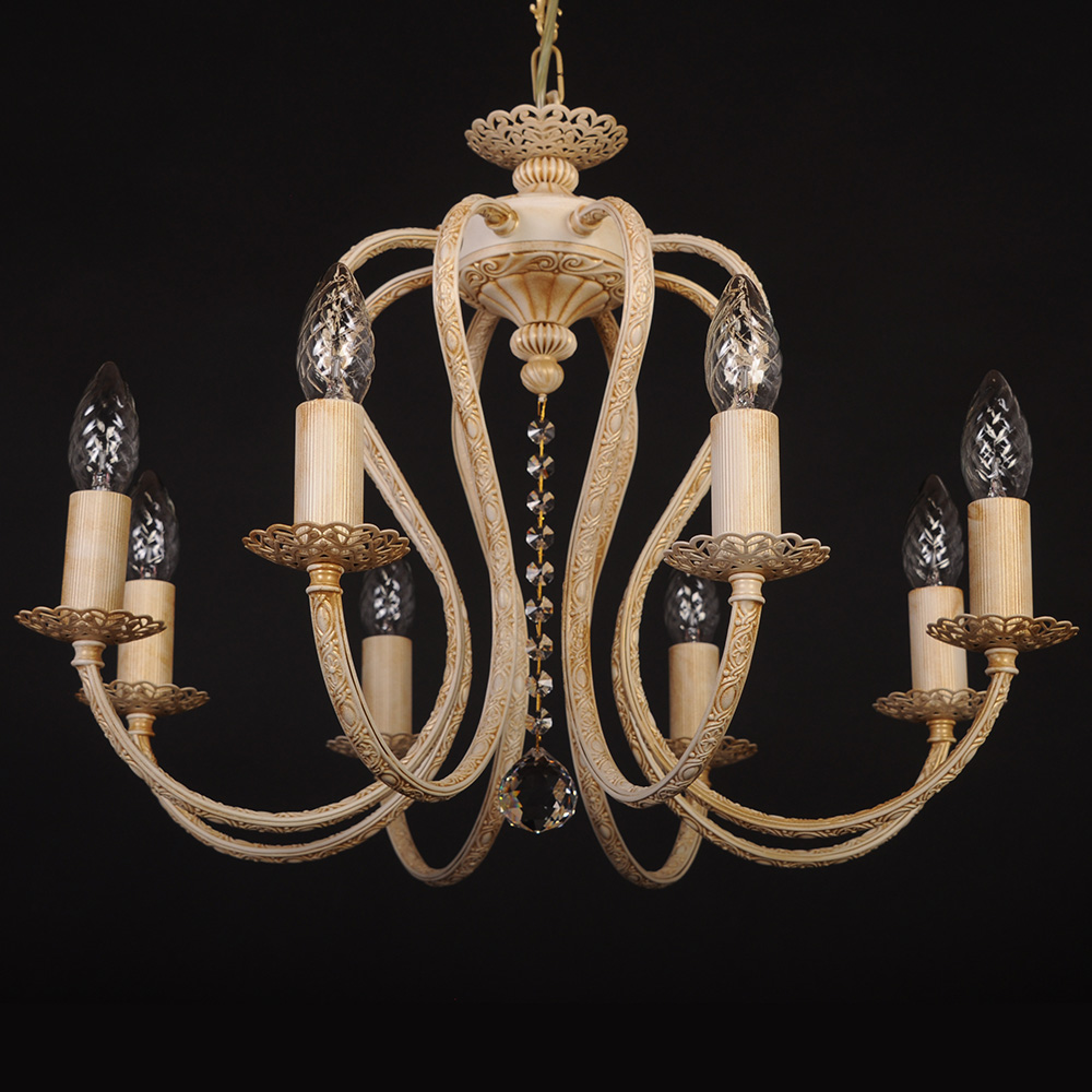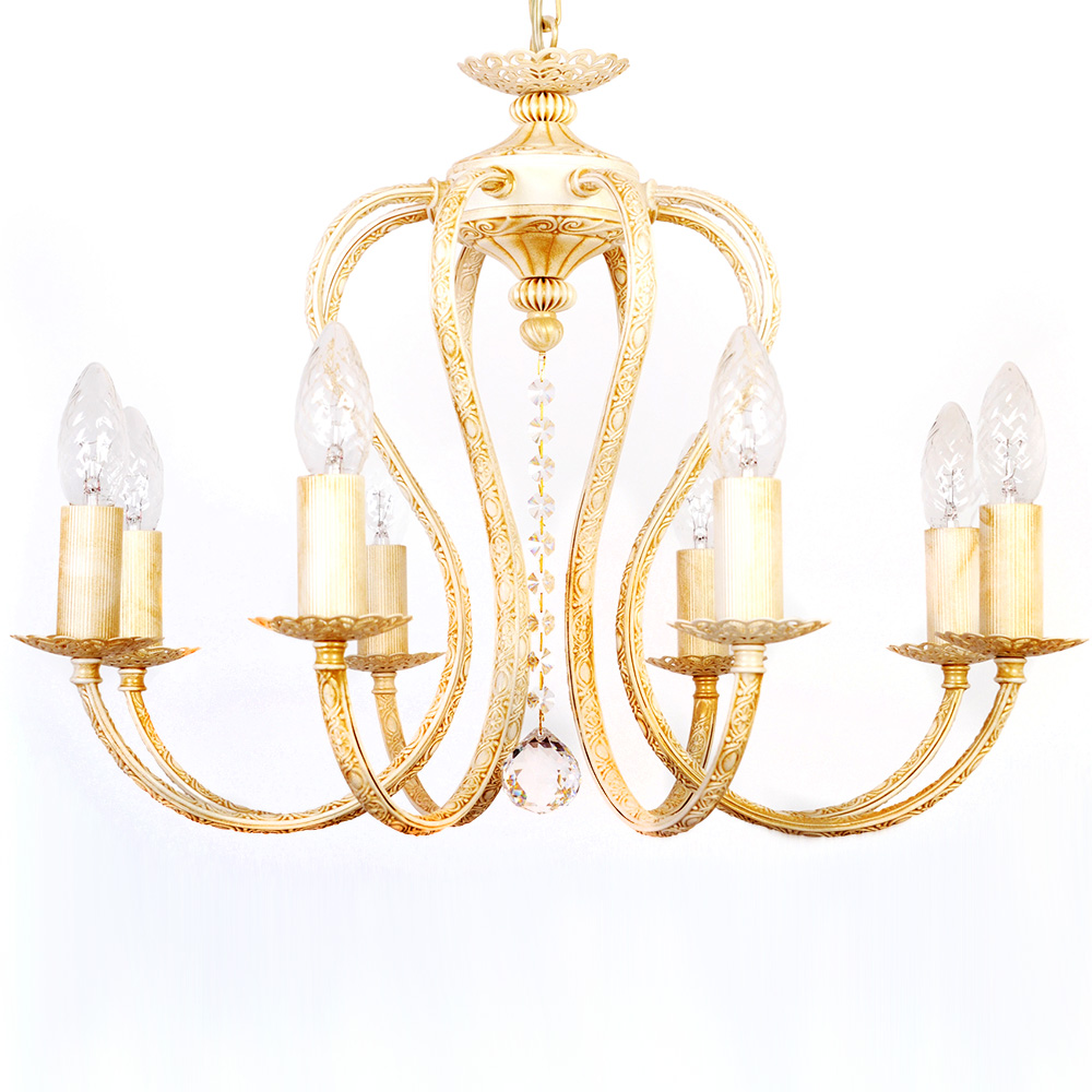 Золотистые завитки керамического корпуса, словно застывшие в танце, обрамляют центральный кристалл, чьи грани играют алмазными бликами даже при выключенном свете. Восемь изогнутых рожков с декором из листьев и цветов мягко освещают пространство, превращая обычный вечер в магический ритуал. Каждая деталь — от цепочки-подвеса до винтажных ламп «свечей» — напоминает о временах, когда роскошь была обязательным атрибутом дома.