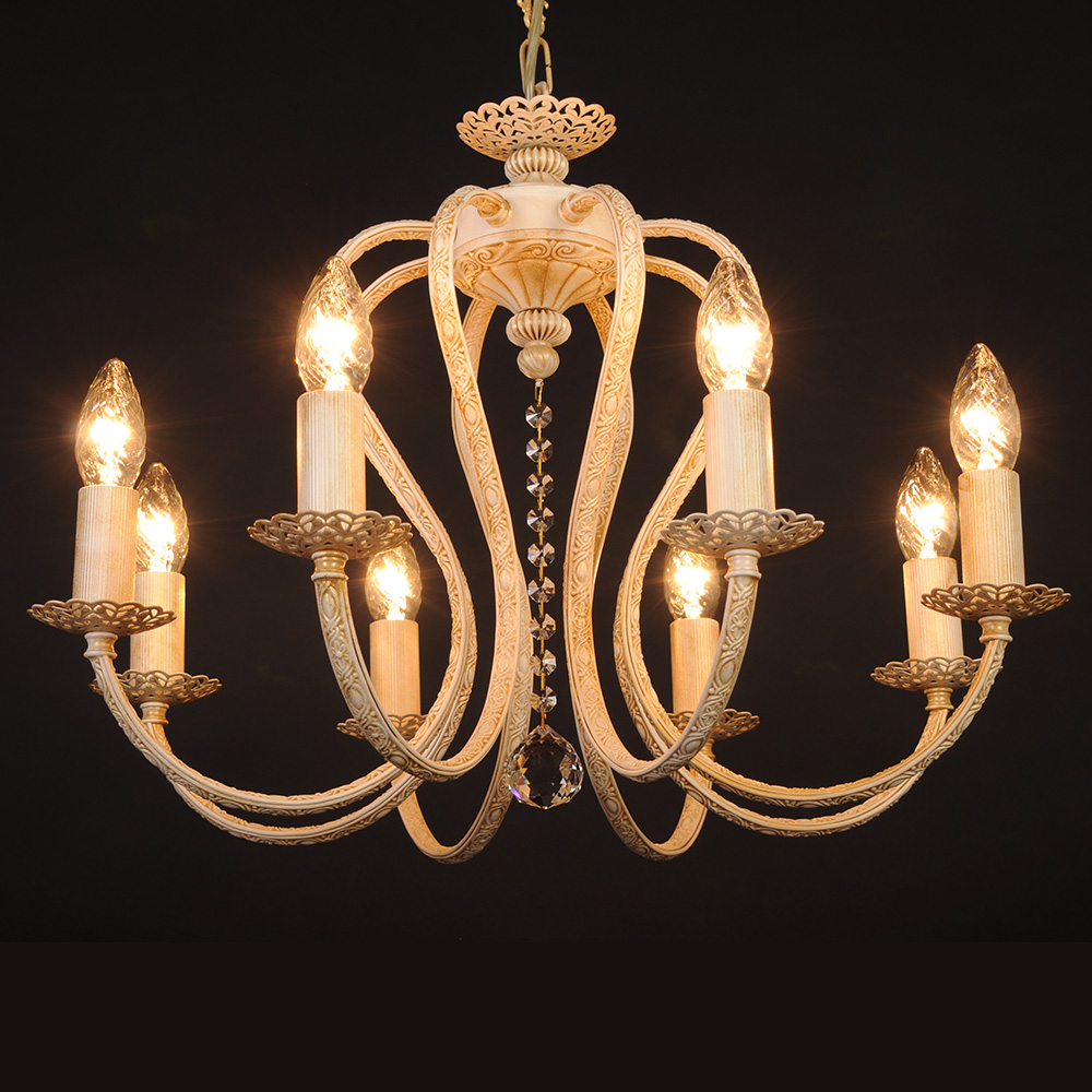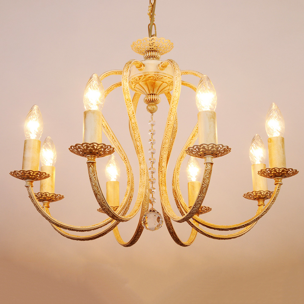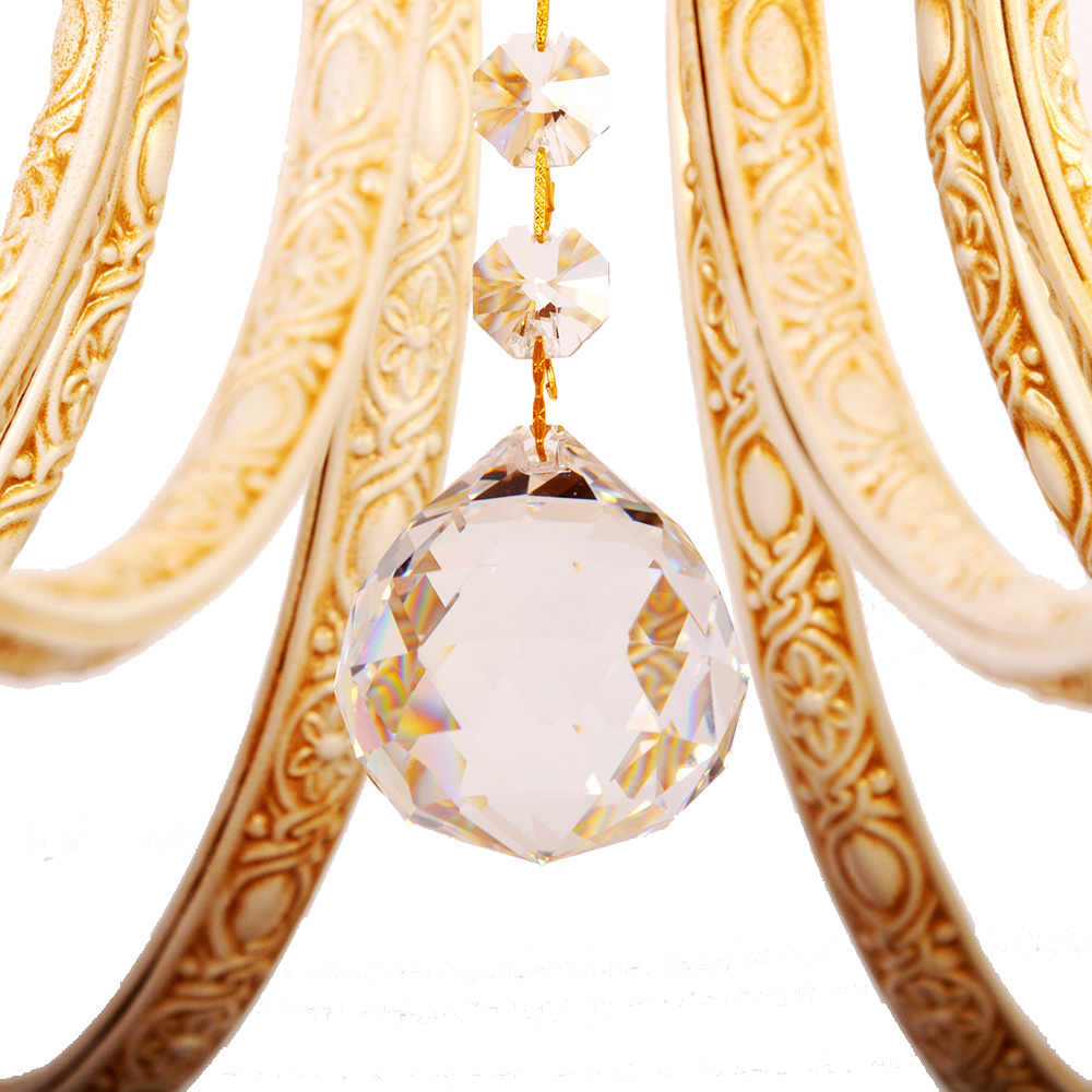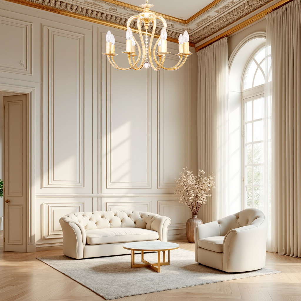 Золотистые завитки керамического корпуса, словно застывшие в танце, обрамляют центральный кристалл, чьи грани играют алмазными бликами даже при выключенном свете. Восемь изогнутых рожков с декором из листьев и цветов мягко освещают пространство, превращая обычный вечер в магический ритуал. Каждая деталь — от цепочки-подвеса до винтажных ламп «свечей» — напоминает о временах, когда роскошь была обязательным атрибутом дома.