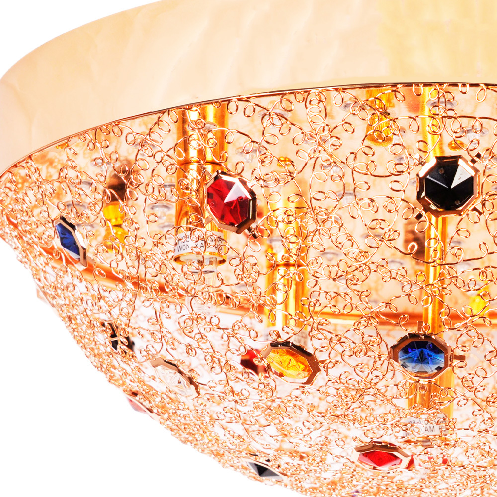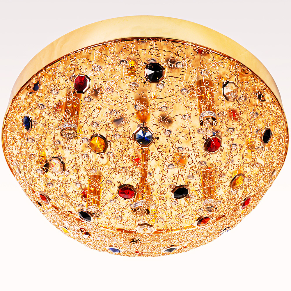 Её дизайн строится на контрасте: монументальная форма-полусфера обретает невесомость благодаря ажурной вязке из золоченого металла. При дневном свете этот ажур отбрасывает изящные тени, а с наступлением темноты — превращается в сияющий ореол, делая саму люстру источником мягкого, струящегося свечения.