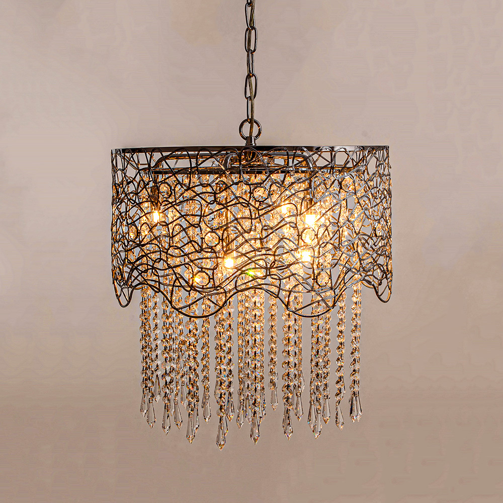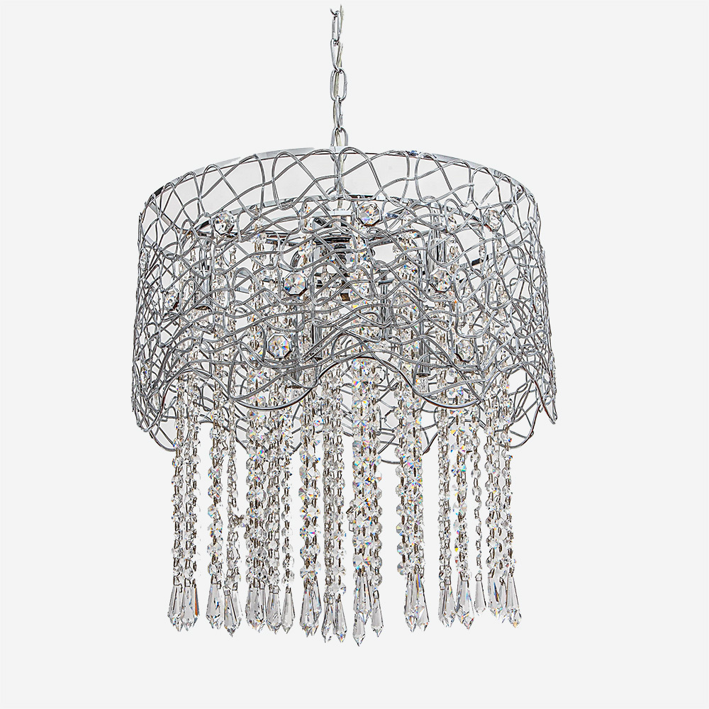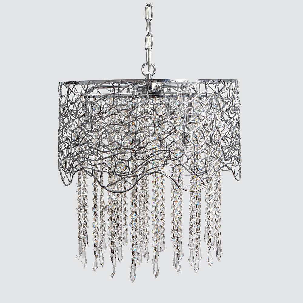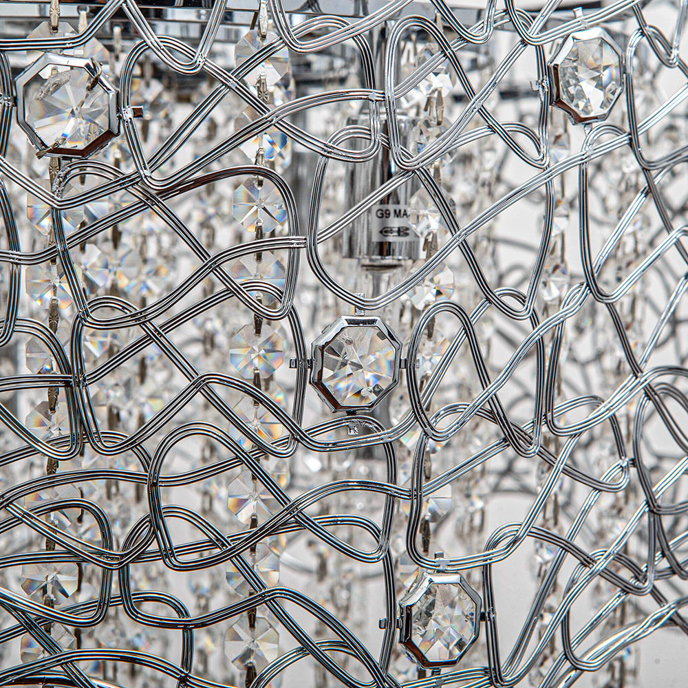 Ее ажурный каркас, подобный тончайшему кружеву из серебристого металла, создает ощущение невесомой паутины, поймавшей в свои сети тысячи солнечных зайчиков. Поверхность люстры украшена множеством мелких хрустальных кристаллов, которые переливаются и отражают свет, создавая эффект мерцания. Эти кристаллы расположены в хаотичном порядке, что придает люстре динамичность и живость. А свисающие вниз длинные подвески рождают каскад искрящихся бликов, превращая обычный вечер в волшебную сказку.
