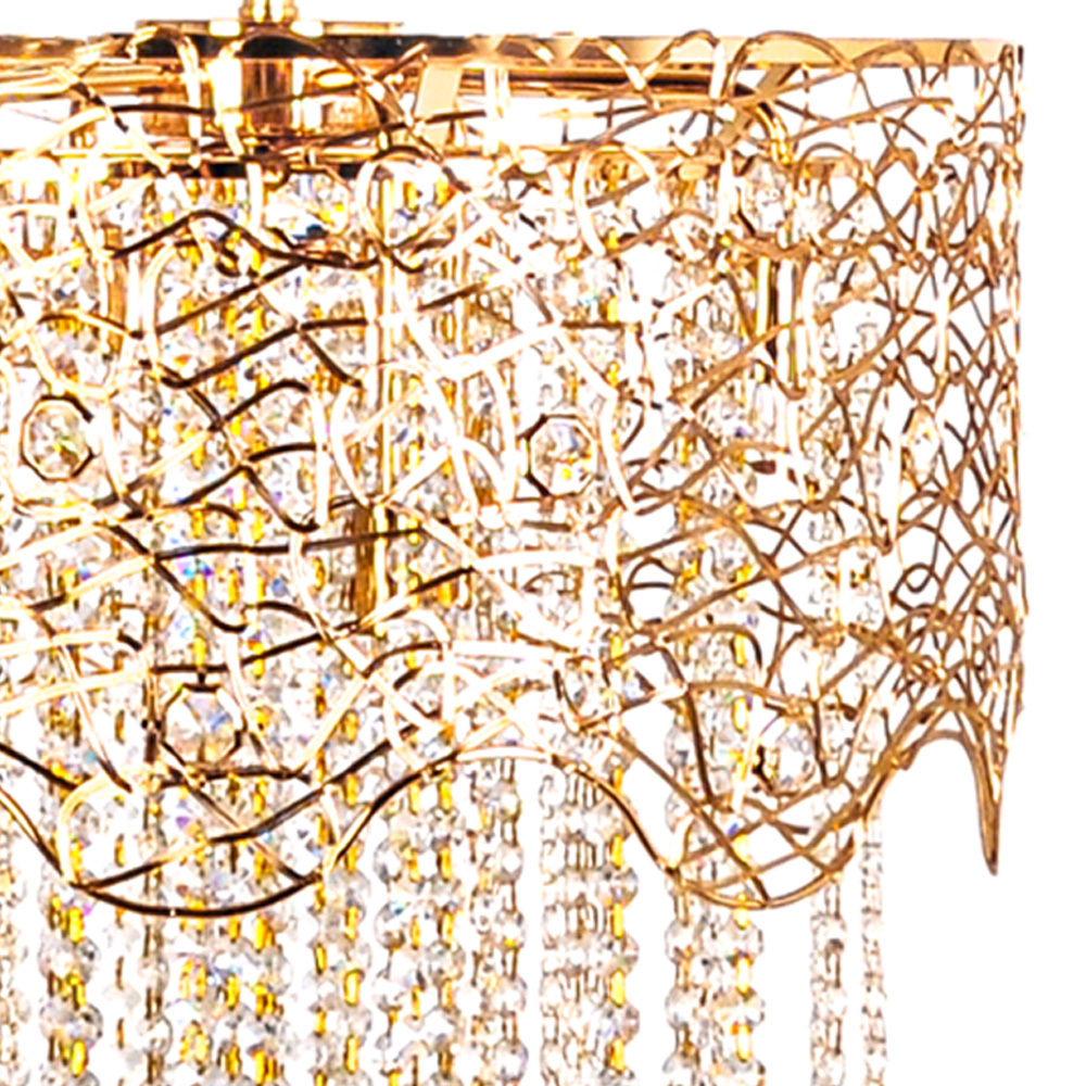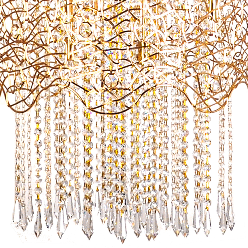 Множество хрустальных кристаллов, закрепленных в художественном беспорядке, и ниспадающие каскадом длинные подвески раскрывают свою магию при включении, наполняя комнату миллионами искрящихся бликов и завораживающей игрой света.